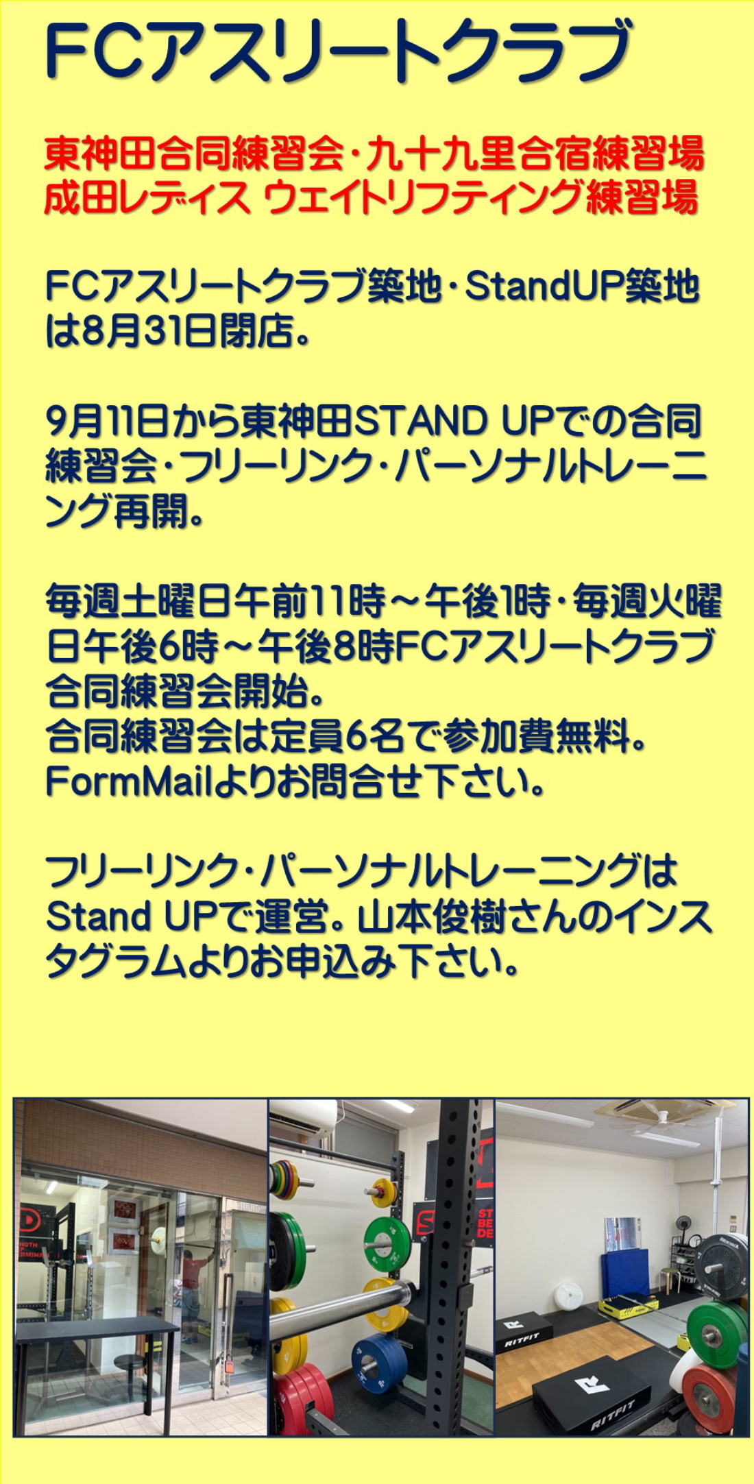 FCアスリートクラブ~築地ジム1階・2階はクロスフィット築地CrossFit Tsujii 200kgDropウェイトリフティング練習場。3階はStand Up Studioパーソナルジム。千葉九十九里は会員専用別荘・トレーニング施設。